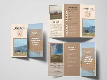 I worked with State Bank as an Intern. I helped in the decision-making process of choosing a logo as well as color schemes designed by an outside Graphic Design Firm. I then took those choices and created business cards, money bags, and envelope/letterhead layouts. I also created an informational brochure for them.